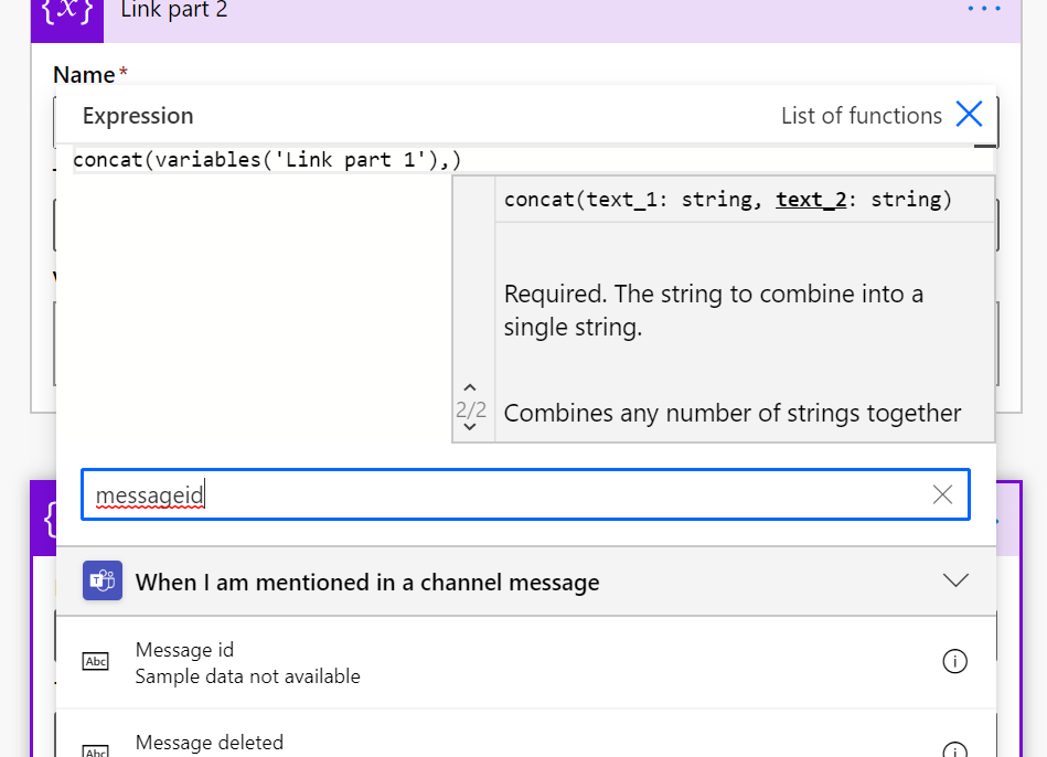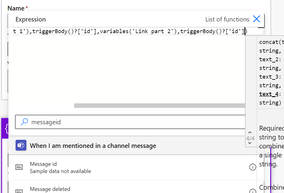 Write messageid to lower part where it says “Search content from previous steps” and then choose Message Id that is shown under blue label “When I am mentioned in a channel message”.