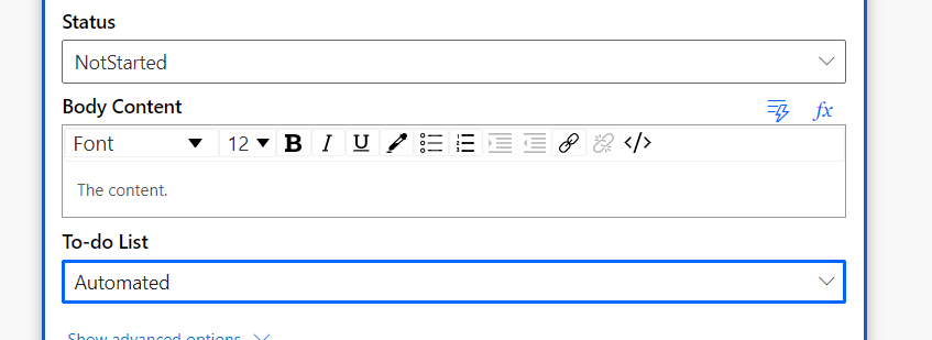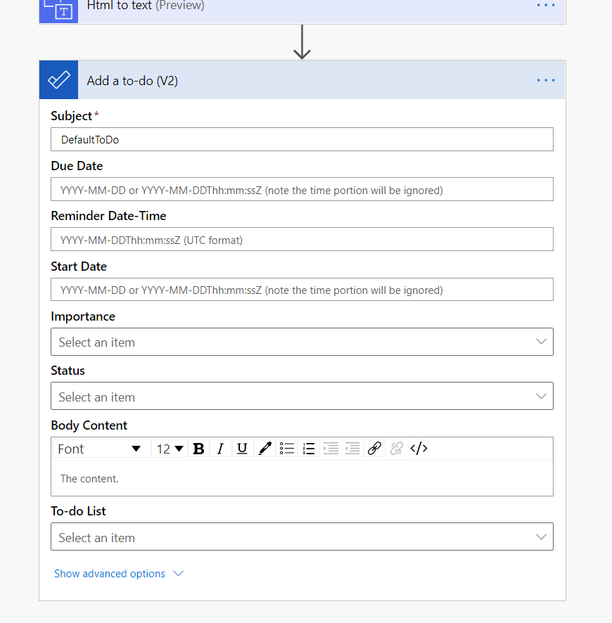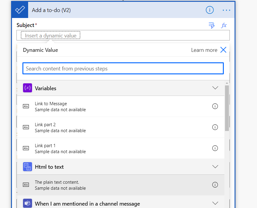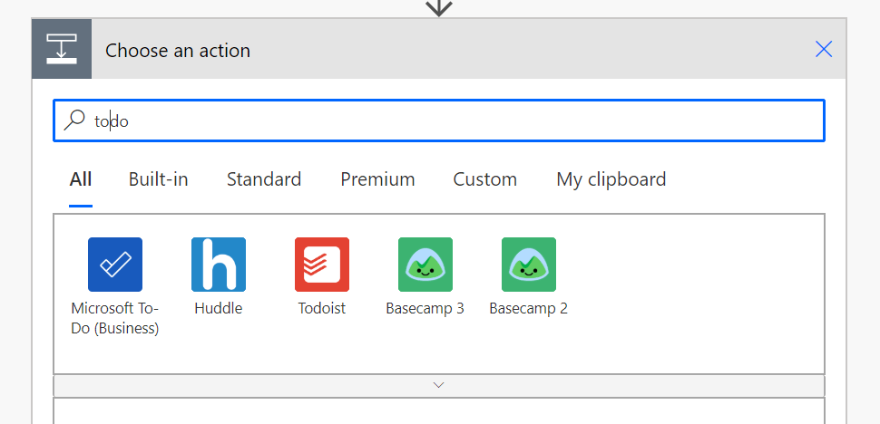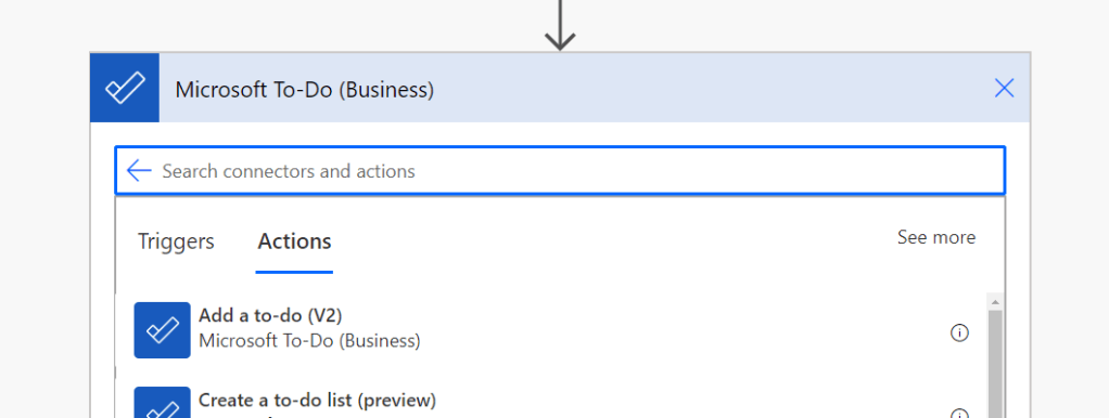 Click on “Microsoft To-Do (Business)” and choose from the bottom part “Add a to-do (V2)”