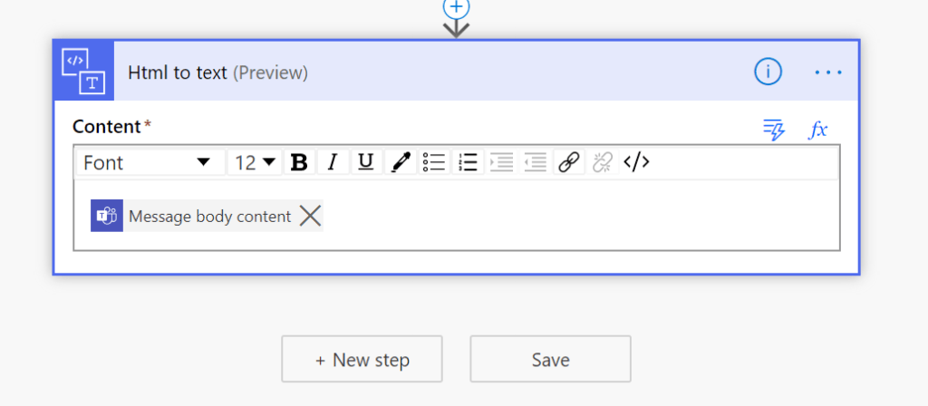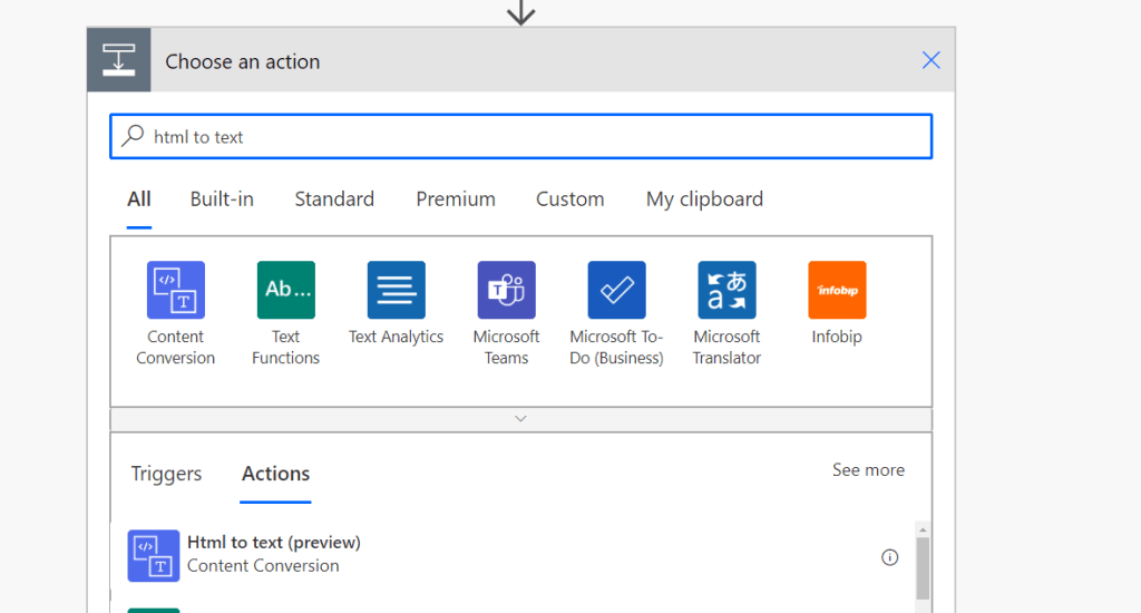 Click + New step on bottom and search for html to text. This is needed to be able to have a clear text in our task, instead of html coded text.