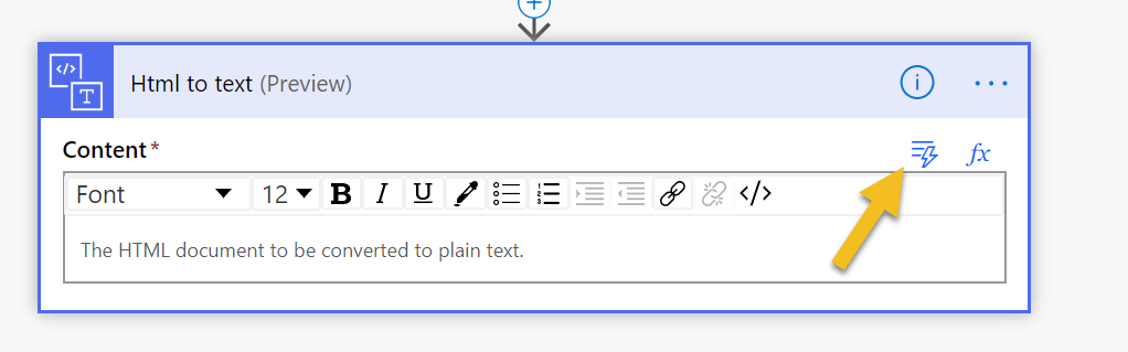 Click on Html to text (preview) to add it. Then click into to the text area and click on lightning symbol.
