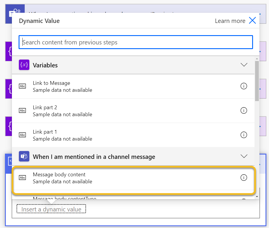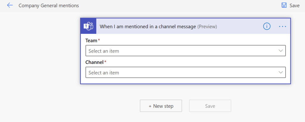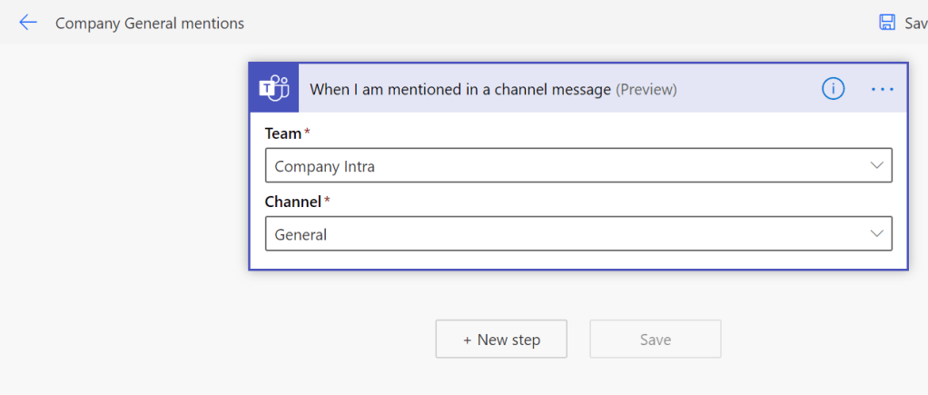 First: You have to specify a team and channel for each “I am mentioned” trigger. This of course limits where you can use this. My advice: pick those channels that you know are most used for requests that you have to take of. Those most critical ones that cause you bad sleep for missing tasks (and money loss for the company).