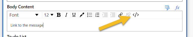 The last thing we fill is the Body. We put there the link to the conversation. For that write , for example, “Link to the message” in the text and then switch to code(!) view.