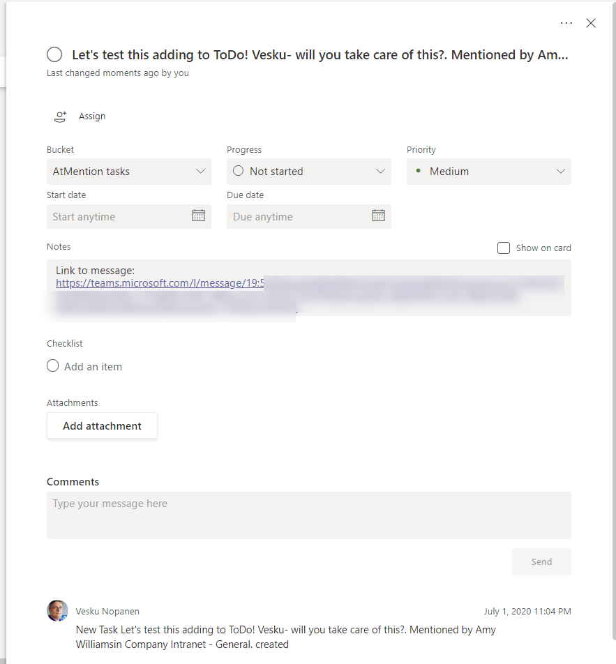 Alternatively you can point tasks to a specific planner( tasks) bucket – this is useful especially if you have a team of people who could help you – so the task would be visible to everyone. HR is a good example here: if the HR Manager/lead is mentioned in a company HR channel there is usually a HR issue that anyone from the team could answer – not just that mentioned person.