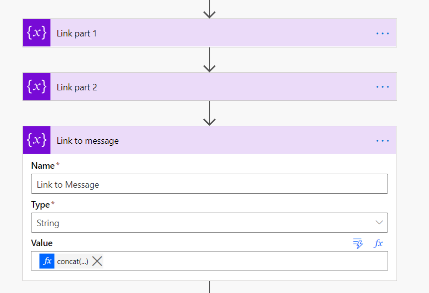 For Link to Message Value you hit Fx in the right and enter a formula. I also walked through the steps in the earlier post but this time you choose the “Message id” from the section “When a channel message is added”