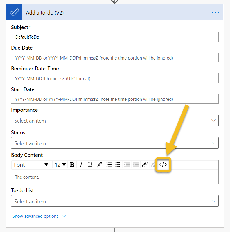 You will then add “Add a to-do (V2)” action and set it’s values. First you need to switch to the code view to enter Body content.