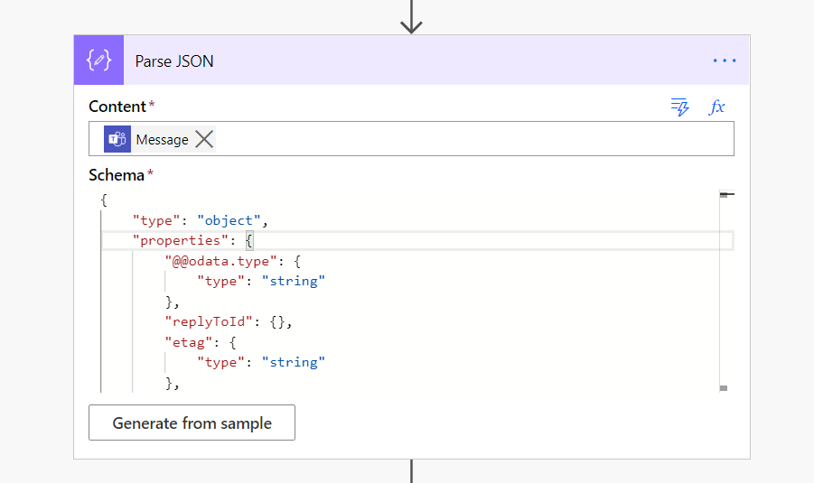 Use Generate from sample to create a schema. You get a message by looking into this flow’s run history and choosing the output of the trigger (When a new channel message is added). Or you can this one – however, it can cause issues since I haven’t added any null checking there. That schema also shows what information you have at your disposal later in the Flow. Using this instead of parsing URL together manually can be useful if you are planning to reuse this flow in different channels. Then you only need to change team/channel in the trigger.