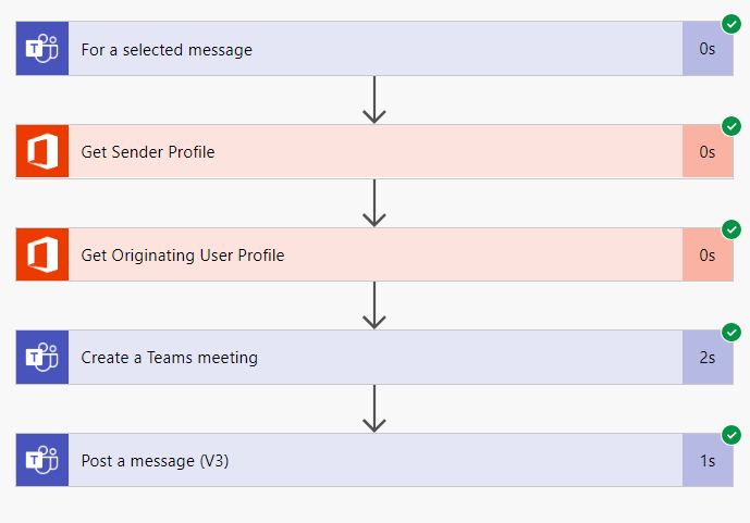 Looking at the action it looks like it will be super-simple to create new meetings in a Flow action. This opens nice possibilities for several scenarios. One is automation of meetings based on business processes “setting up meetings with customers automatically” or perhaps that is being done with a bot (Power Virtual Agents make this really easy). I chose to explore just a simple scenario of creating a meeting with a person who wrote a specific Teams message.