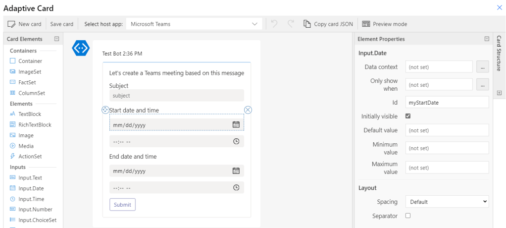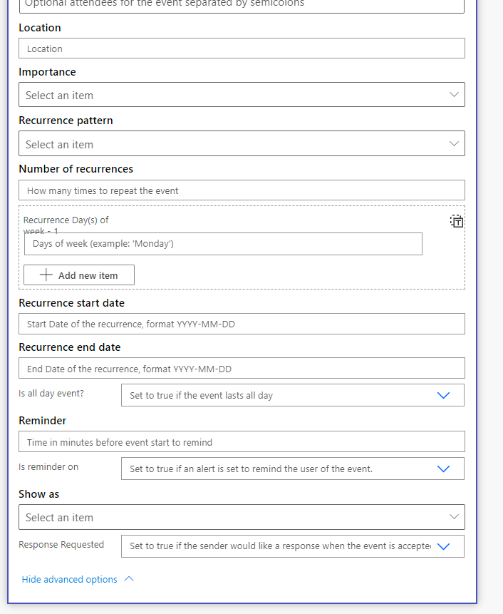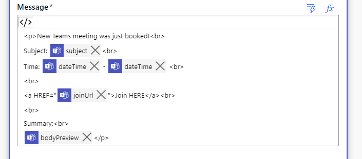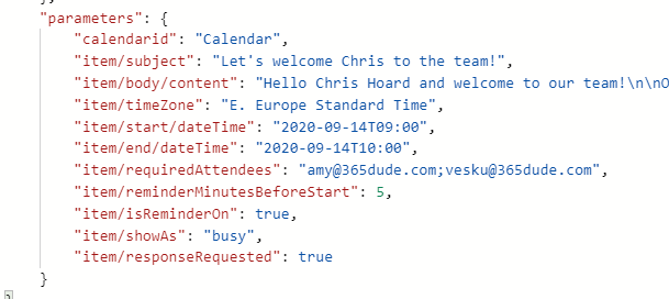 We get several variables from the Adaptive Card like mySubject and dates & times. Since this is a demo flow I didn’t have to ensure data & time format input checking but if you are building a Flow for an international / global organization I recommend testing it well and checking for inputs before using that. Of course when using a different source for information also ensures that dates and times are in the correct format.