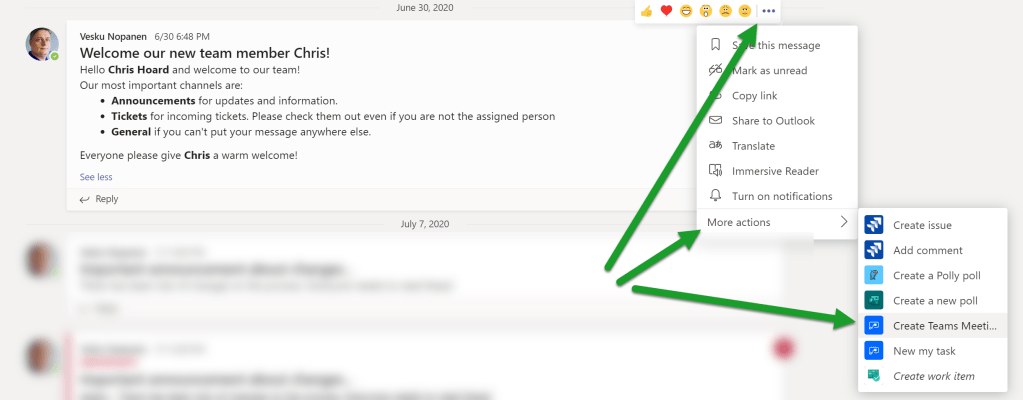 I tested this as “Amy” who is one demo user in my demo tenant. She launched the action “Create Teams meeting” to one old message I had – welcoming Chris to the team.