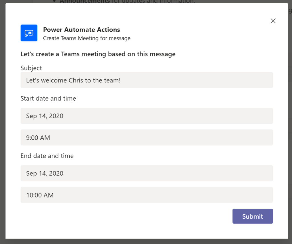 I used the “for selected message” trigger to initiate a Flow based on a single Teams message as a starter. In that trigger I can open a Adaptive Card to ask for more information like Subject of the message and meeting dates. It also gives me access to various information about the message used. See my earlier blog post for more info about For a selected message -trigger.