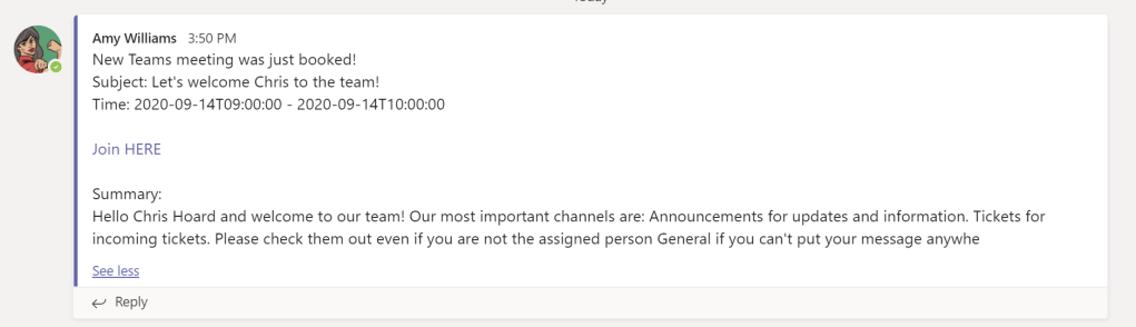 All information seems to be good. The join-link to Teams meeting works as well. As you can see the Summay-body isn’t that useful. The better option is to ask for the user to provide a meeting description AND then insert the link to the original message in the body. To see how link can be inserted there check my To-Do blog post.