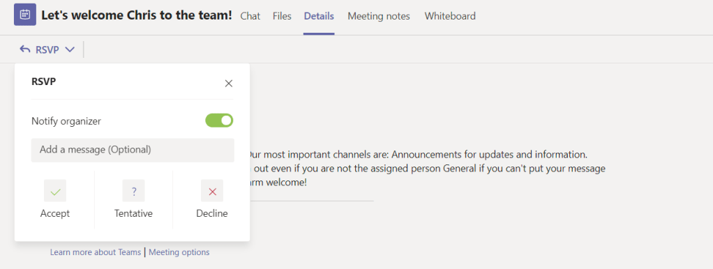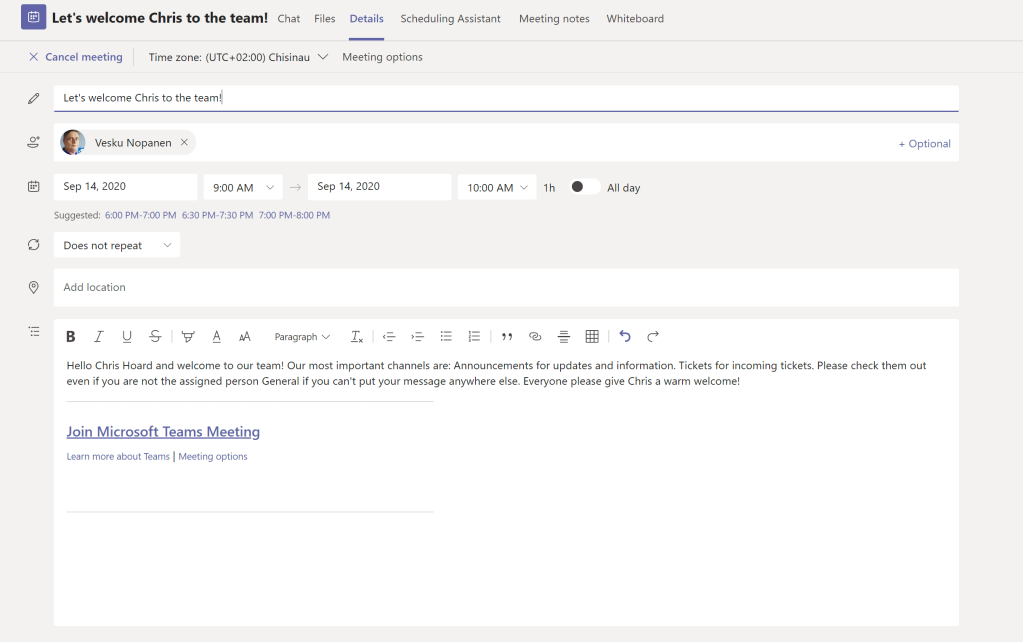 All the other things: attendee, start & end date&time are correct – and the meeting body looks a lot better now than in the channel post.