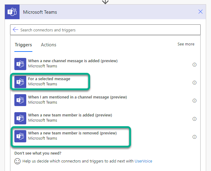 The “For a selected message” should be familiar to you now. However do note that you can also create processes when a user is either removed from a team – or leaves it by user’s own choice. This way a project/business owners can be up to date who are in the team – who has the access to the contents for example. But also it can initiate exit-processes like removing user’s access to other content sources or systems.