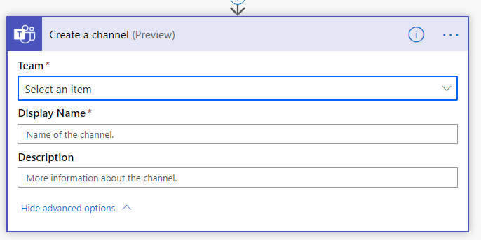 This does not allow creation of private channels and this has the same issue with selected Team as with Add a member to a team: you have to select team from a list instead of using a dynamic value. This hinders the usability of this action to processes that are created to a single team – instead of using this in provisioning or doing actions dynamically. It has it’s uses of course but this could do much more.. Hoping that this will be updated later as well.