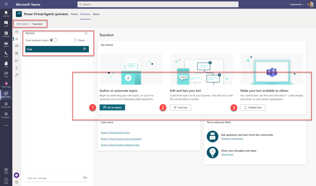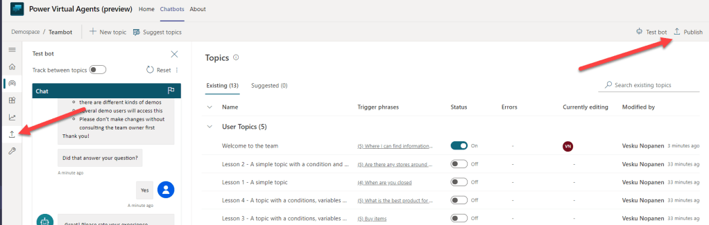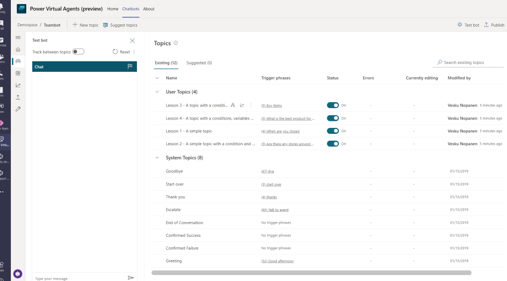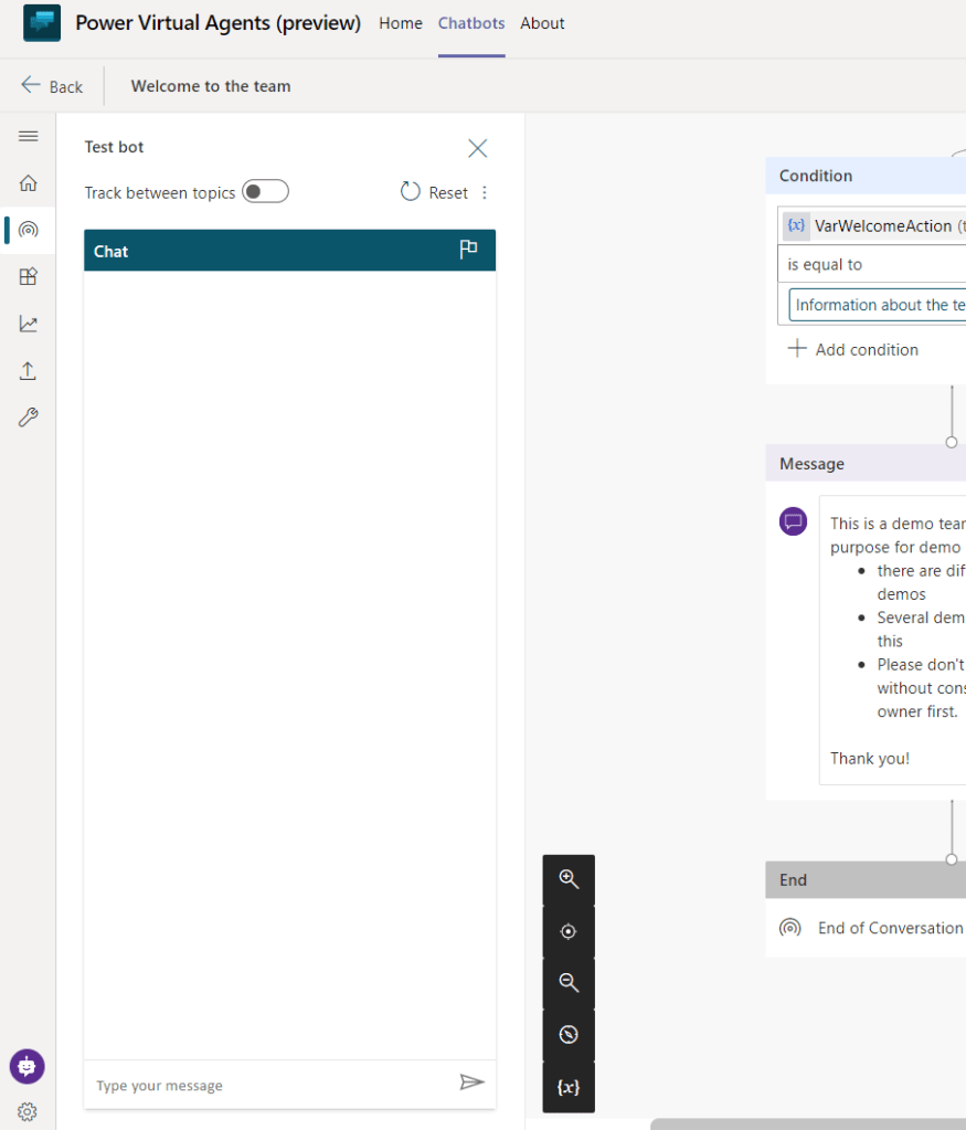 - After you have done topics (or even meanwhile) you can use the Test bot functionality to make sure bot works without giving access to anyone else