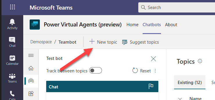 - Go to topics to create bot conversations and actions. This is bot’s logic.