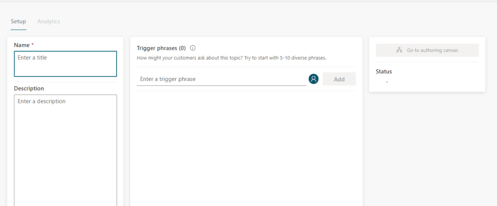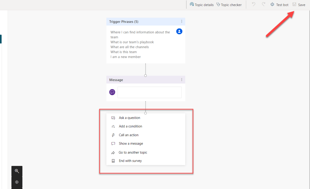 You need to enter the topic a name (Welcome to the team) and some trigger phrases how this conversation begins. After adding Trigger phrases make sure to Save topic before moving to the Canvas. During my tests I have found out that you can loose some important information now and then unless you save before moving to another dialogue or screen. So with the words of Larry: Save early, save often.