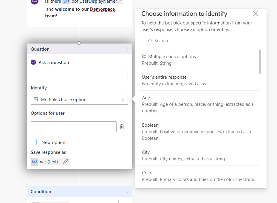 - Ask a question allows you to ask questions from the user, there are several predefined models available. If you create a question with multiple answers you can choose to branch the conversation flow from there.