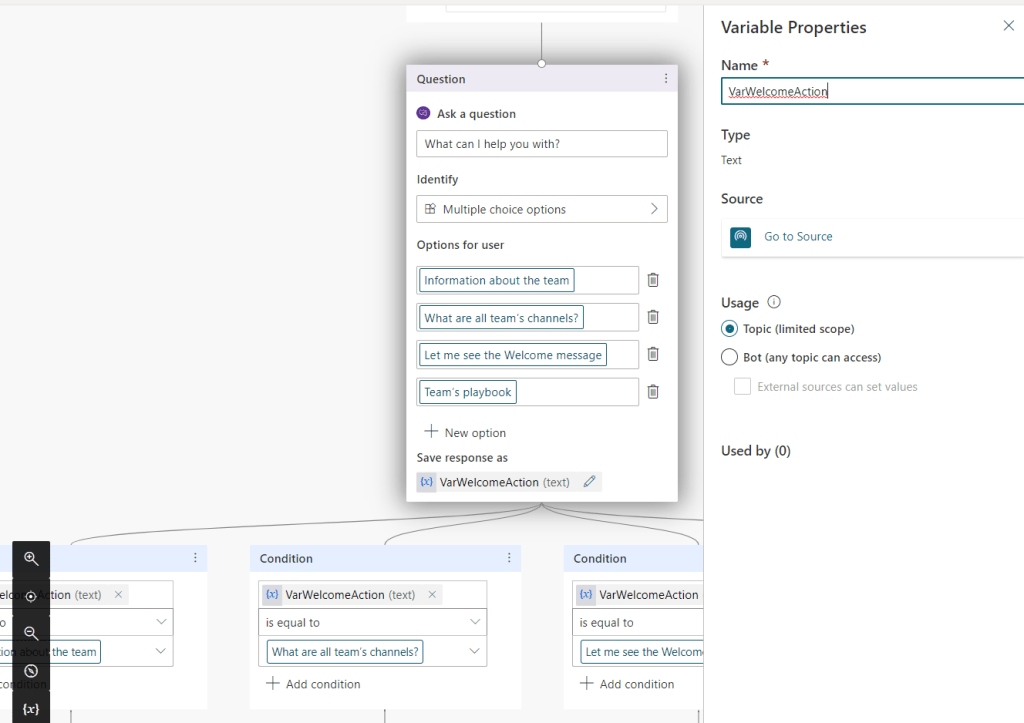 When we define the variable to save the response we have option to save it so that the answer is reusable across different topics in the bot. This is useful when user is asked to provide information and if that information is already provided it can be skipped. For this particular bot we don’t need to remember the answer.