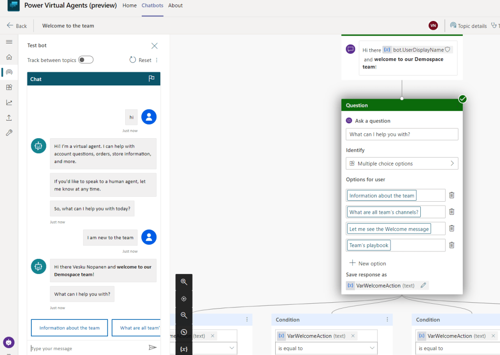 As can be seen the user is already authenticated! Greeting user with the personalized message is as easy as choosing the bot.UserDisplayName from the variables list! After that let’s go on and ask a question: