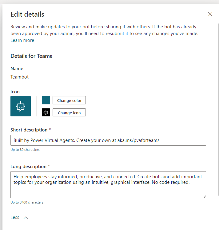 Clicking on “Share the bot” opens the screen where you can edit Bot details and also share it to your team. Let’s take this route first.