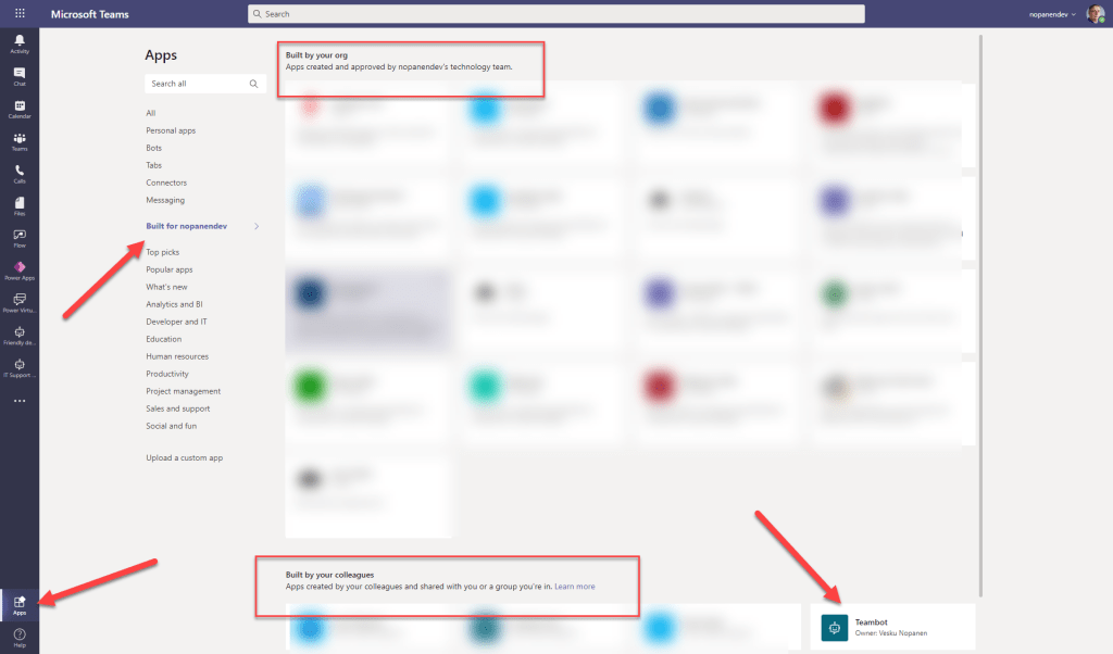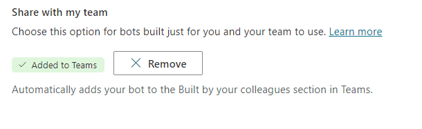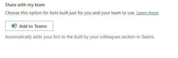Now everyone in your team can be instructed to add the bot to themselves using Apps and looking for “Built by your colleagues” section.