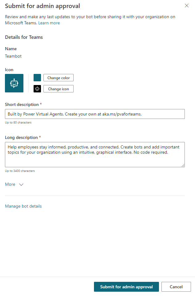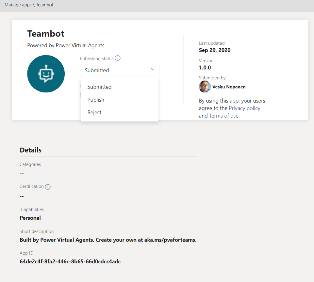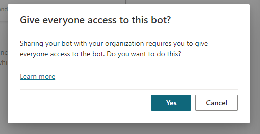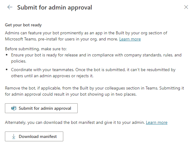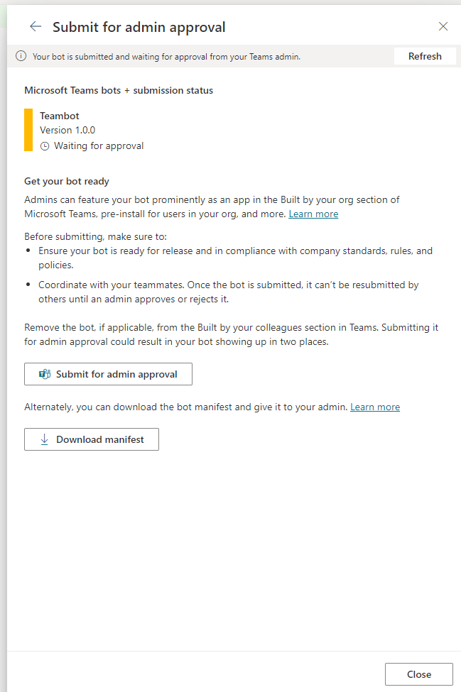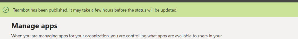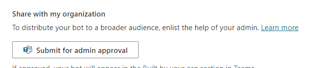 Ok – that was for the team member. How about adding the bot to others (group of people or everyone) in my organization? Let’s share the bot to everyone in my company! For this you will need to inform your Teams Admin about the new bot they need to approve.