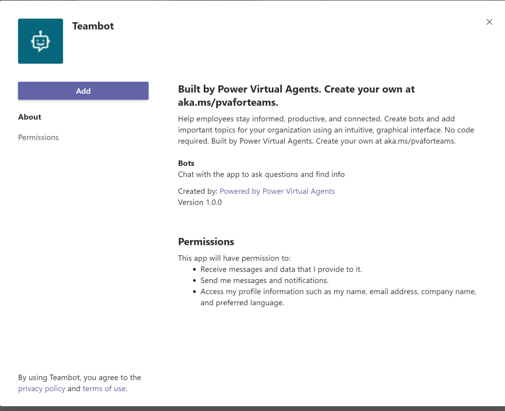 And this bot adding screen is where those details like description, privacy policy and terms of use matter.