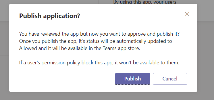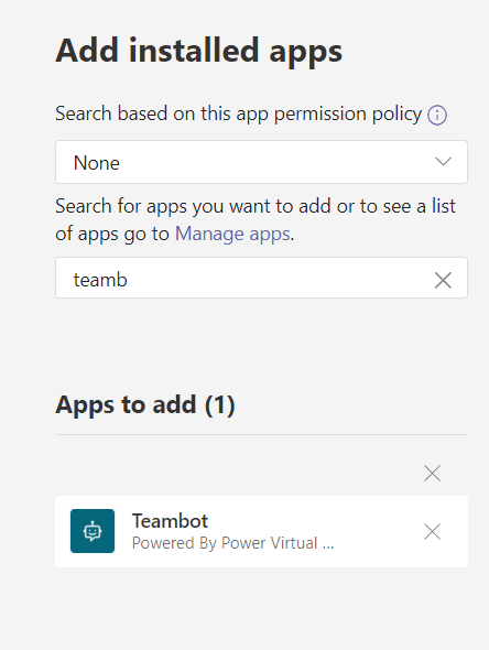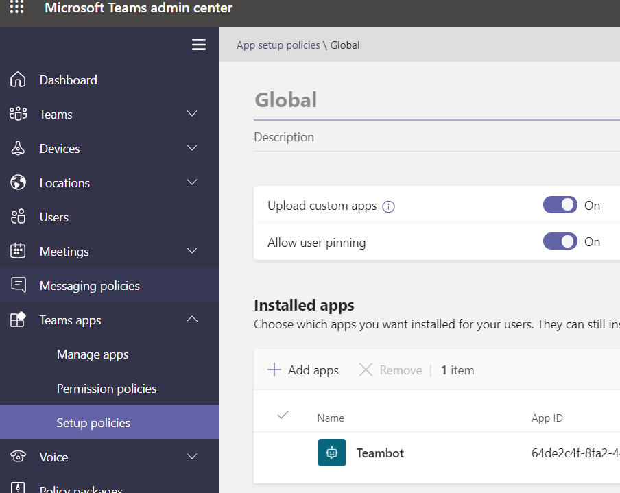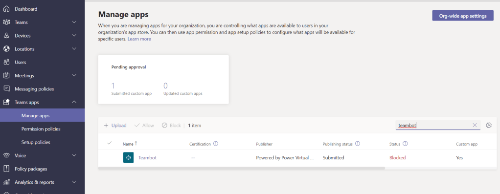 Once the Admin opens the Manage apps-section in Teams Admin and looks for the bot they can see it blocked.
