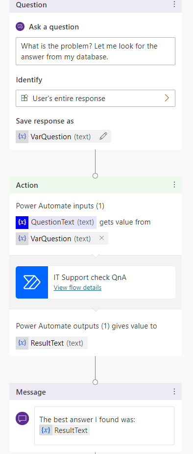 The Flow is also quite simple. The most tricky part is not visible: how to create a QnA Maker connection but I will cover that in the future article.