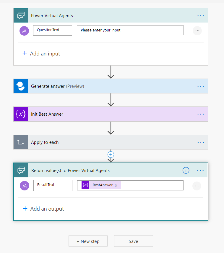 The parameters for input and output are defined in the Flow and question is then passed to the Generate Answer action.