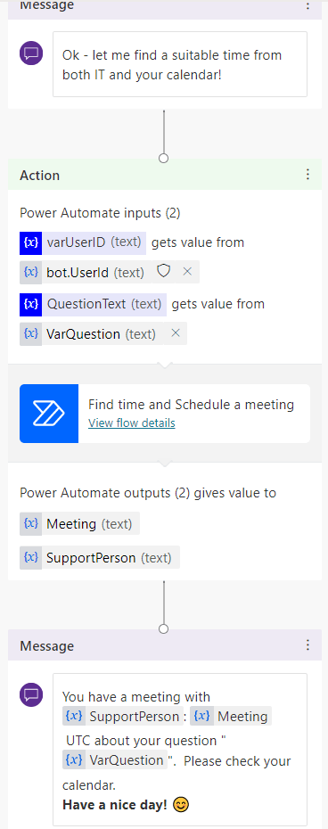 And yes – in every Bot there is a moment when bot just can’t find the answer. And simpler the bot is the more often you will encounter that. Usually there is a “escalate” option how to be in touch with people directly. But why not book a meeting based on people’s available times in calendars? I will cover this scenario in more step-by-step guide later as well – this is just to show it is possible and for enthusiastic power users a spark to start building their own version even before my blog article emerges. This version is still a super-quick POC that doesn’t do nice time conversions nor return the time for user in their timezone..