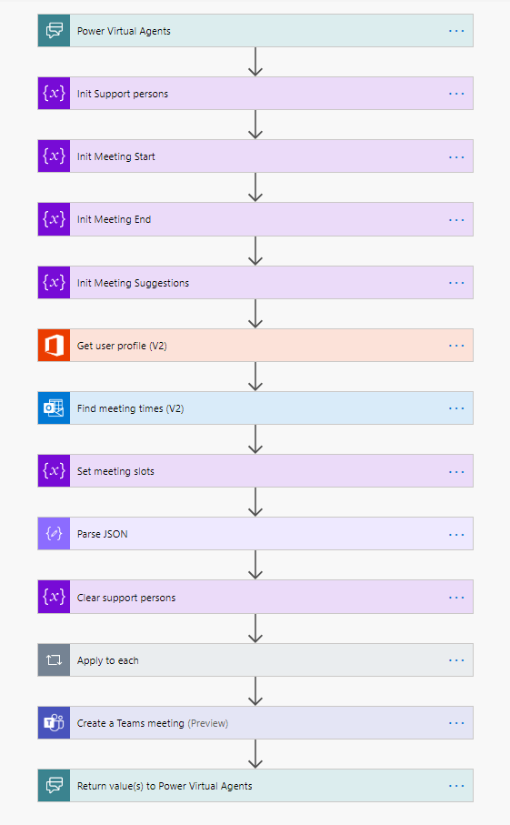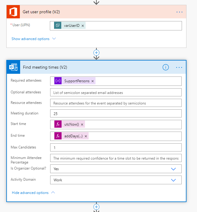For the outcome of the Find meeting times you need to do some Parse JSON to retrieve the person and the beginning & end time of the meeting. I reused the SupportPersons variable to set it to the selected support person. I will show more about that in the future blog post. 😊