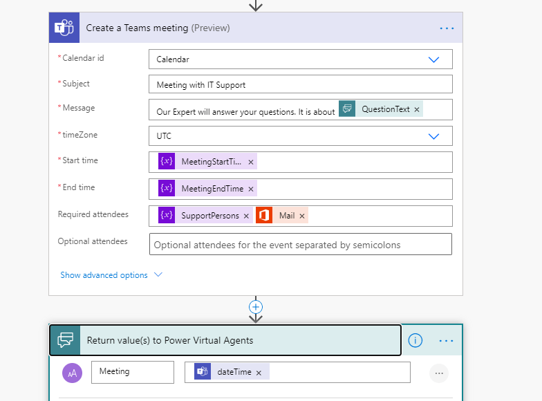 The last two chapters in this post also overview two other, a more Citizen Dev level, ways how to add more capabilities to the bot: searching for best answer in questions & answers database and automatically booking a Teams meeting with support person.