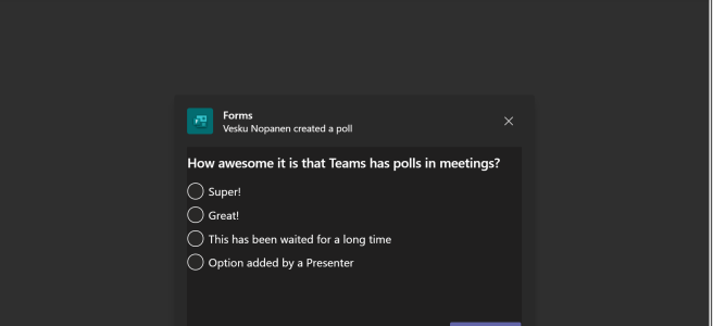 The ability to add polls (finally! Just saying..) to Microsoft Teams meetings became possible recently when the feature to add applications to Teams meetings was released to general availability. Among the first applications to add to meetings were Forms and Polly. Let's take a look how you can add polls to meetings in a step-by-step … Continue reading How to add polls to Teams meetings