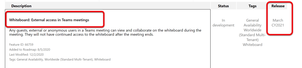 One thought on “Roadmap update: externals access to Whiteboard in a Microsoft Teams meeting delayed to March 2021”