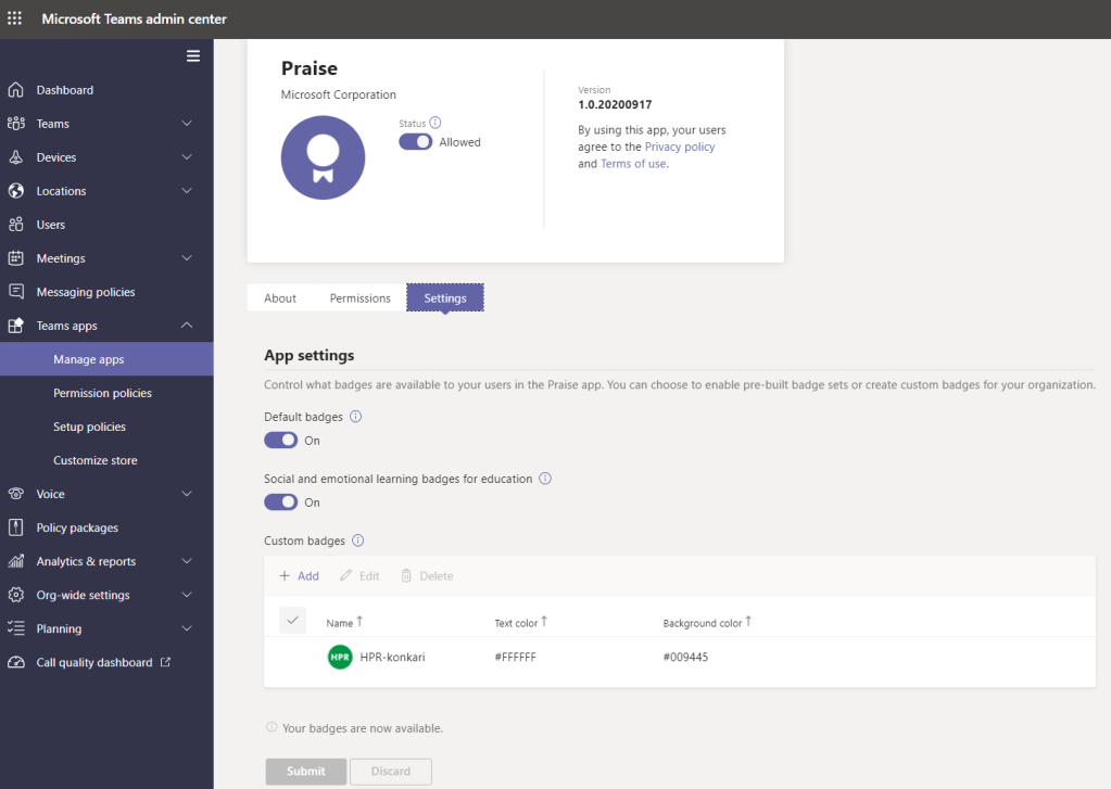 Badges will appear for your tenant’s teams users in a few hours – sometimes it can be faster but sometimes it takes hours. Meanwhile you will see that they are being processed information in the app settings at Admin Center.