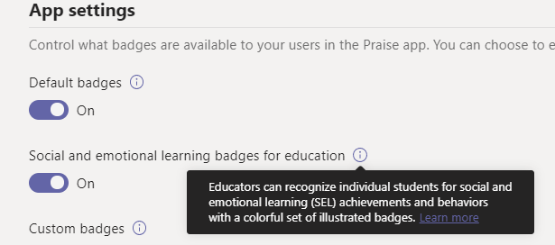 You can choose to turn off Default badges if you wish to. However – those are great basic badges so I recommend you keep them on. Social and emotional learning badges for education are great add – of course if you feel there will be too many badges to choose from then don’t activate it. It is off by default. Learn more about those badges from here. I like the way they look and represent so I’d recommend turning them on.