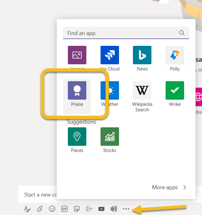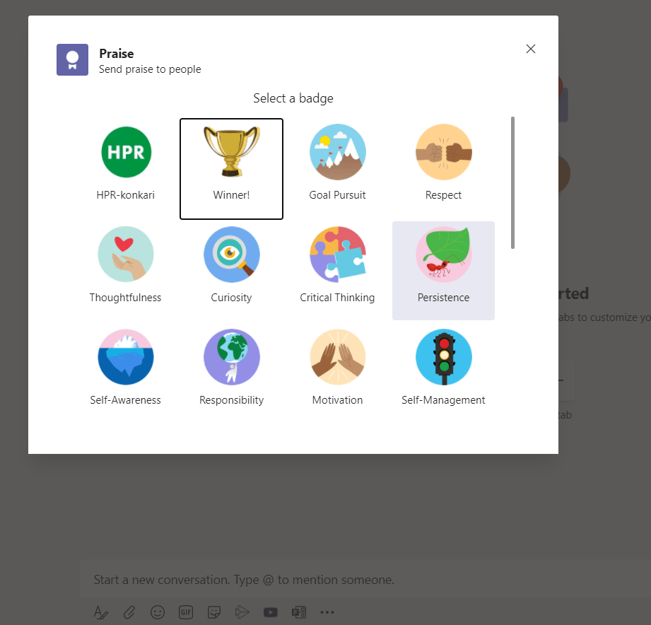 When you are in a channel or in a chat you can add the Praise to the conversation. Hit a new conversation and look for Praise app under … menu if that is not directly available next to GIF and Sticker.