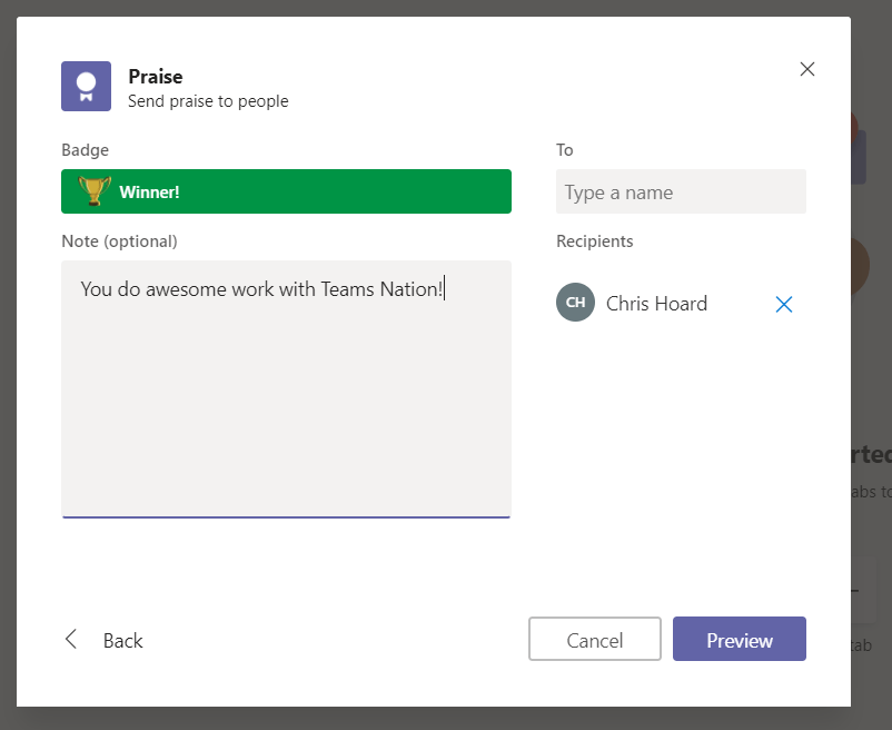 - If you are not a Teams Admin you can take steps from this blog post and ask your organization’s Teams Admin to add Custom Praises