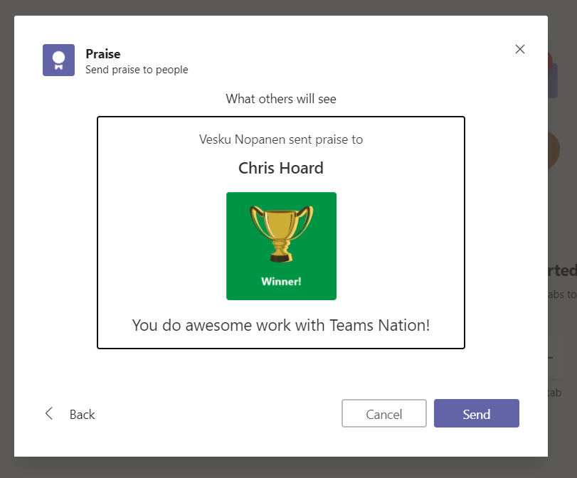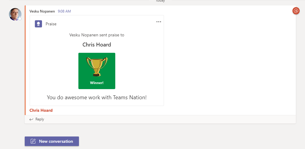 Microsoft Teams got finally Custom Praises out last week. This means you can do awesome praises / endorsements to your colleagues in your own organization theme and color. That makes praises to feel even better and sharing that Good Will & Gratitude makes even more sense. For raising spirits and increasing motivation it is a great practice to give kudos to your colleagues for the work well done. We don’t thank them enough so now is a another great chance to start a new practice and let your colleagues know you appreciate them.