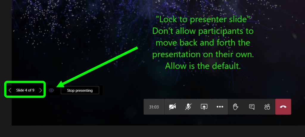 Note: there is the “eye” icon. If you press that one it locks the PowerPoint for the participants so that they see the same slide as you do: they can not browse the deck on their own. This is called private viewing disable (arrows for other participants will be disabled). Private viewing is enabled on default.
