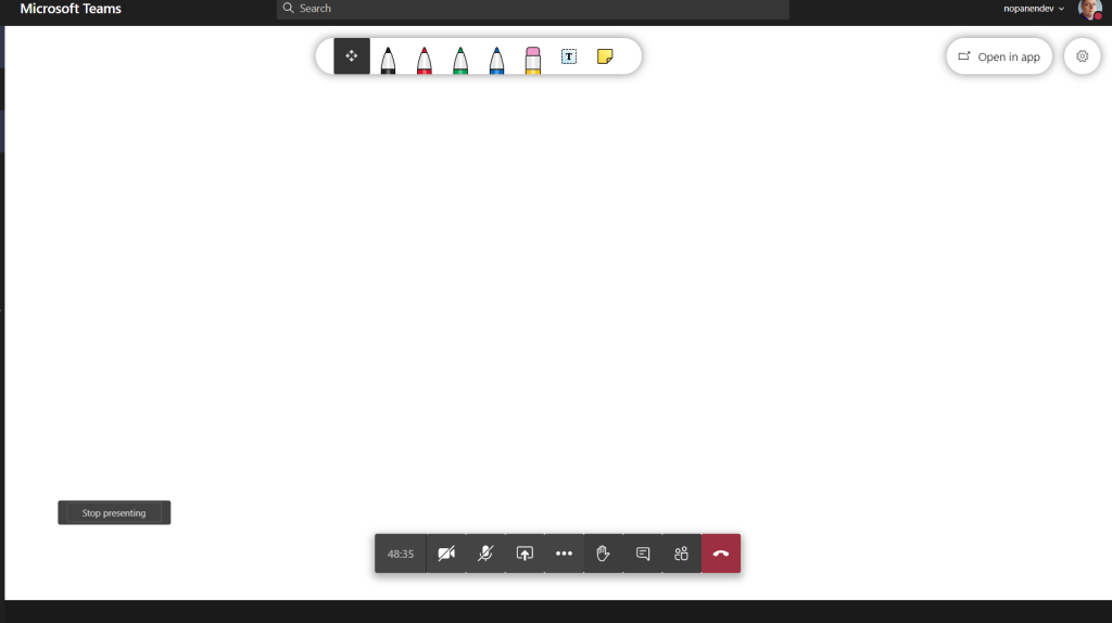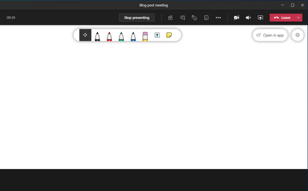 Once the Whiteboard opens you can work on it normally – or choose to open it in the Whiteboard app to have a broader set of tools available.