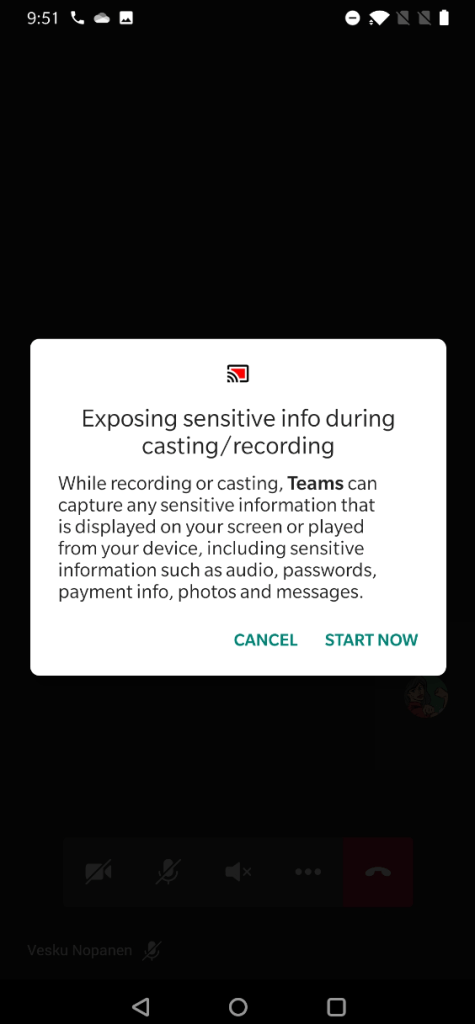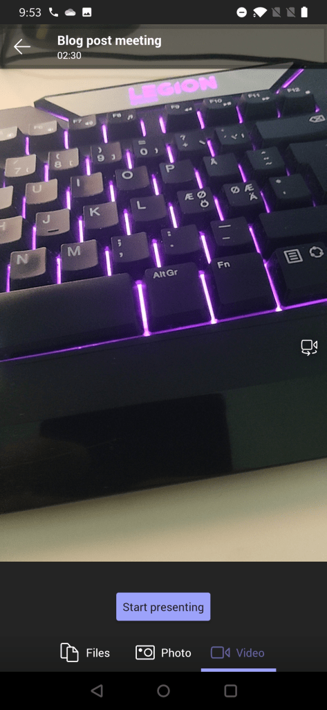 You get to see a preview of video first. You can switch to other camera (front/back usually) & position the device properly and once you are ready you just hit Start presenting.