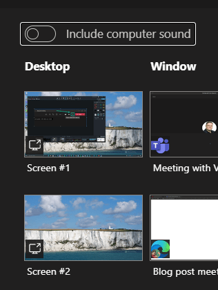 TIP: When you choose to share something using Teams Desktop you can choose to include your computer sounds to meeting. This is a must-have option if you are playing music or video to your participants. You can not toggle this on later – you need to choose this when you start sharing.