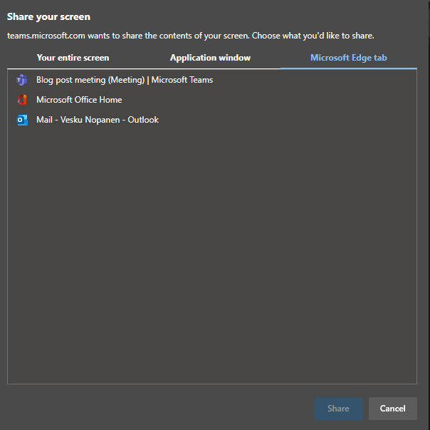 And the last option is to share a selected Edge tab – and if you have multiple Edge profiles open you can share from any of those by clicking the desired Edge active and choosing the tab.