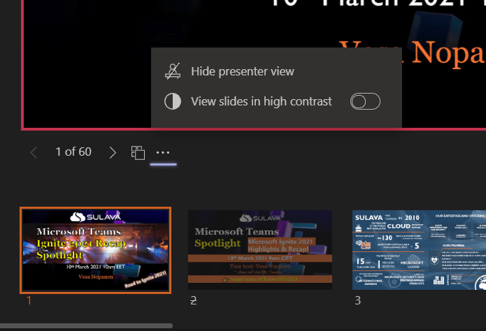- When doing a presentation with multiple persons using just the PowerPoint deck share it directly to Teams meeting so you can switch between speakers easily. With the new Presenter view -support this is now a good option.