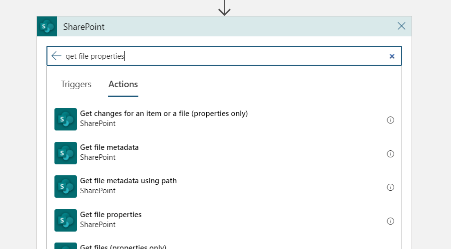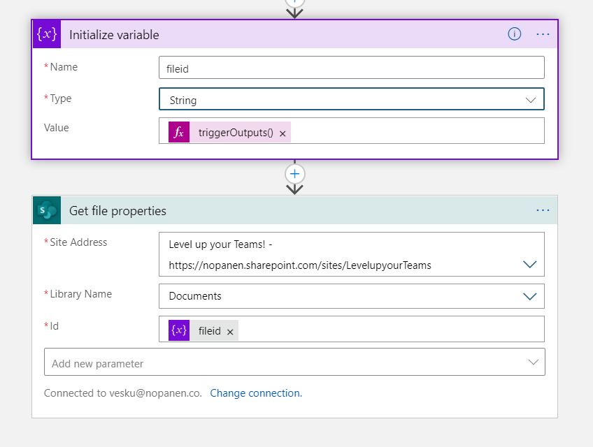 Add there Get File Properties from SharePoint. In this point we need to add a connection to the SharePoint. Use credentials that you seem to be fit.