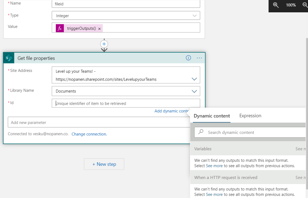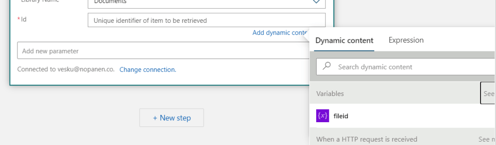 Let’s populate that with triggerOutputs()[‘queries’][‘FileID’] just like in the earlier blog post.