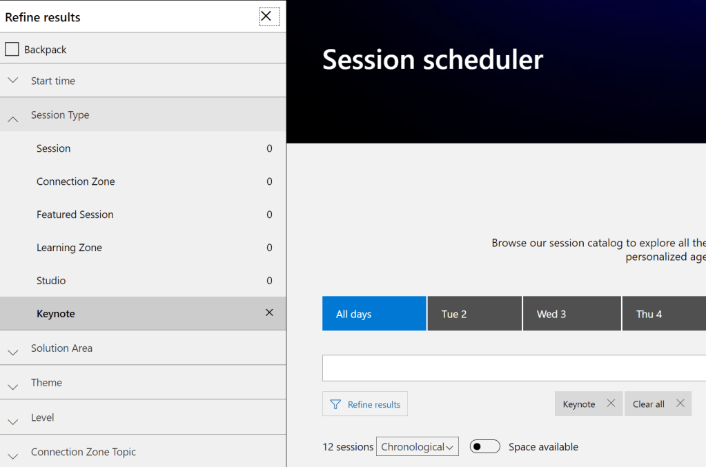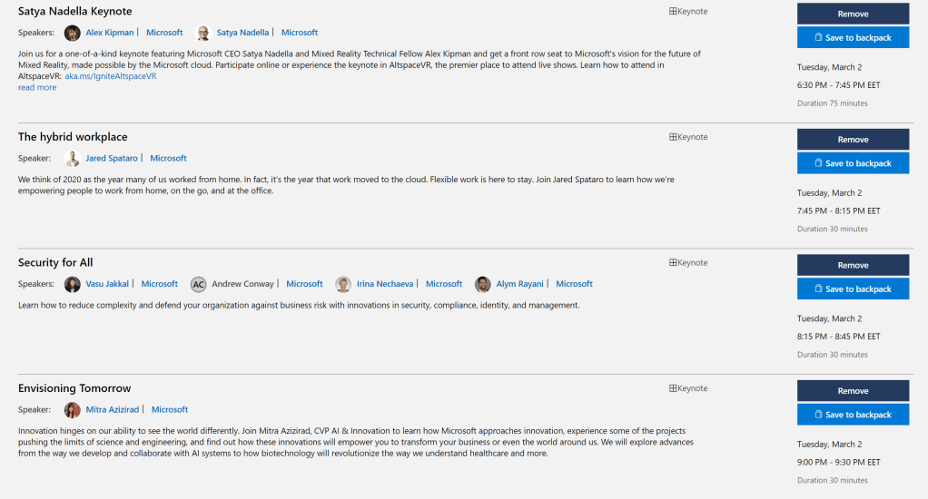 The easiest way to add keynotes to your schedule is to use filtering. This is also recommended for other sessions and products as well: slice it down to your interest areas and add sessions to your schedule or to the backpack so you don’t miss them out!